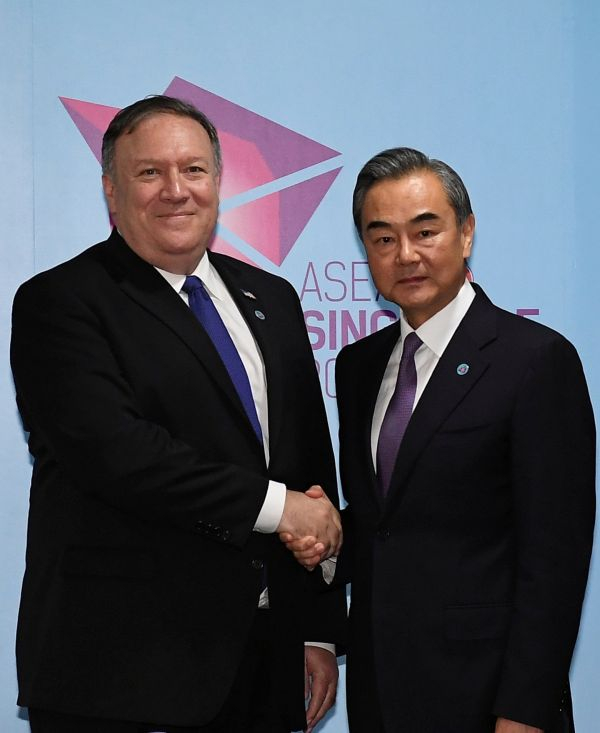 中国国务委员兼外交部长王毅(右)3日在新加坡与美国国务卿蓬佩奥举行会谈。法新社