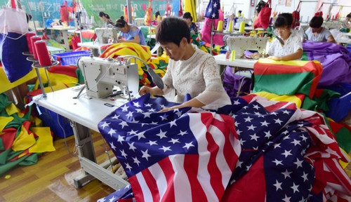 7月,安徽省一家旗帜生产厂正在制作为特朗普竞选第二任期而订货的旗帜。(香港《南华早报》网站)