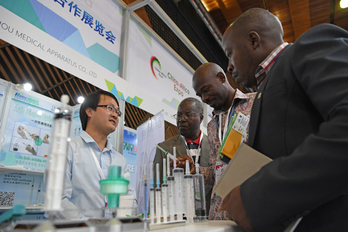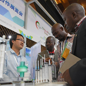 2017年12月在肯尼亚内罗毕举行的首届中国非洲产能合作展览会上,参展中国企业向非洲观众介绍相关信息。(陈诚 摄)