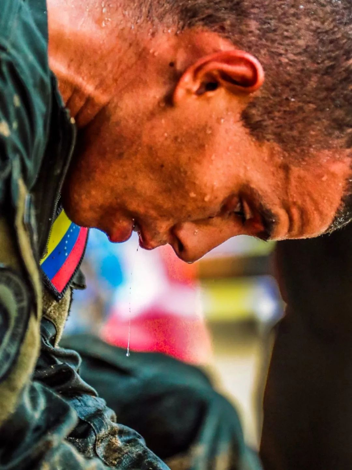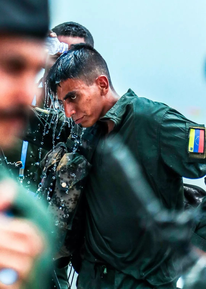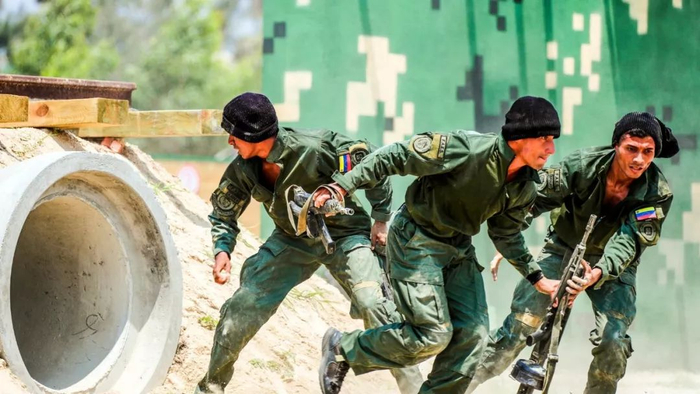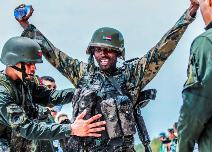 ▲“国际军事比赛-2018”海上登陆赛现场,委内瑞拉队员列队欢迎苏丹参赛队凯旋。