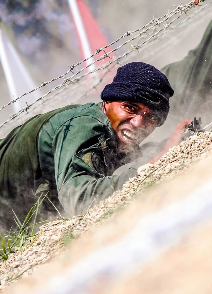 ▲“国际军事比赛-2018”海上登陆赛现场,委内瑞拉参赛队员通过低桩铁丝网。