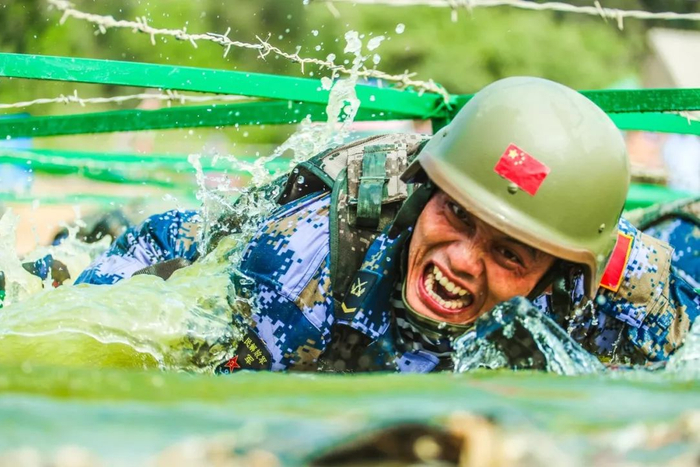 ▲“国际军事比赛-2018”海上登陆赛现场,中国参赛队员通过低桩铁丝网
