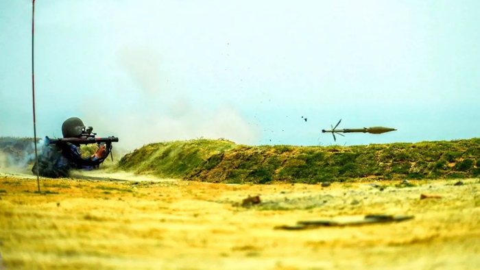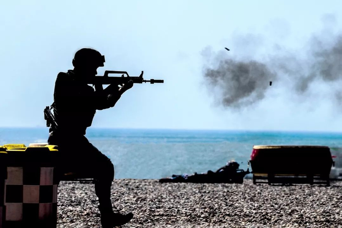 ▲“国际军事比赛-2018”海上登陆赛现场,射击瞬间