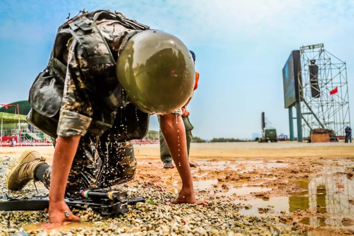▲“国际军事比赛-2018”海上登陆赛现场,中国参赛队通过铁丝网