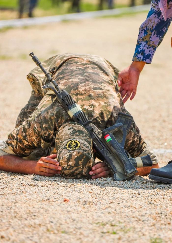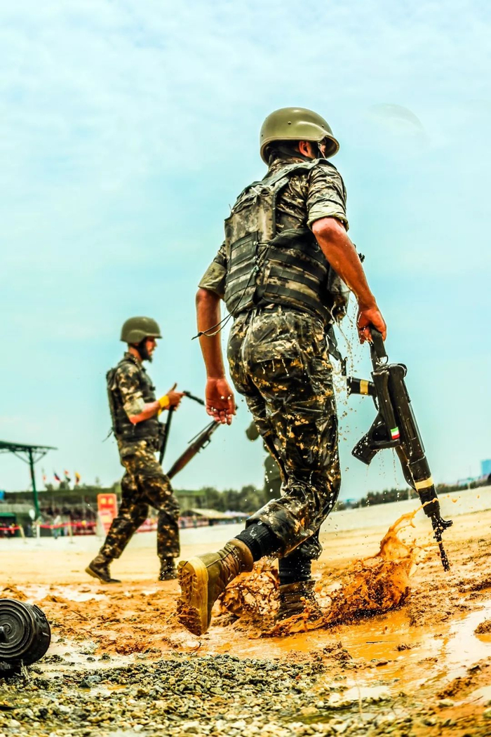 ▲“国际军事比赛-2018”海上登陆赛现场,伊朗参赛队员通过低桩铁丝网。