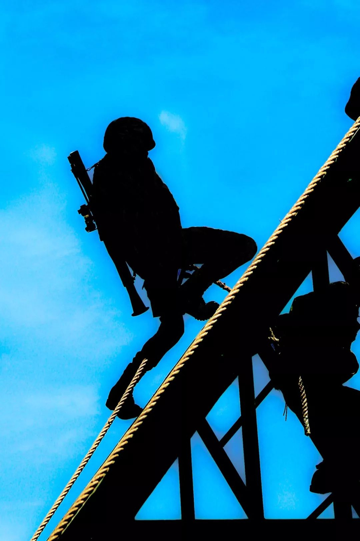 ▲“国际军事比赛-2018”海上登陆赛现场,中国参赛队员通过带绳索斜墙