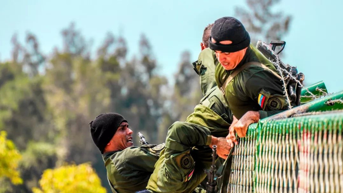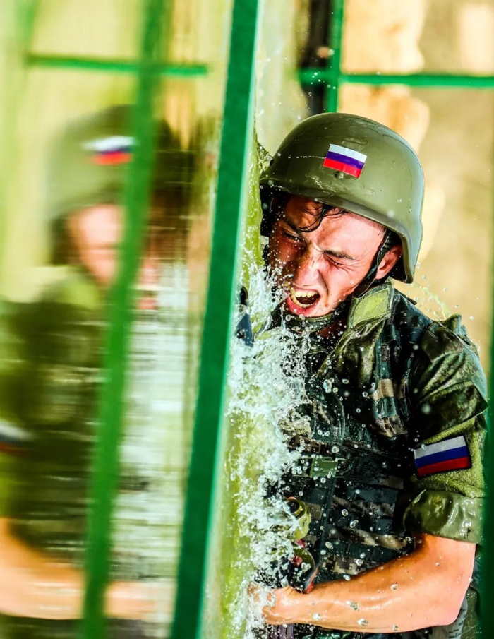 ▲“国际军事比赛-2018”海上登陆赛现场,委内瑞拉参赛队员通过北约标准围墙。