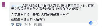 一网友表示,大陆给台湾民众方便,“把我们当自己人看,你蔡英文和民进党有给人家大陆游客、陆配任何方便吗?人家对我们释出善意,我们却用恶意回报?这就是民进党的人品吗?”