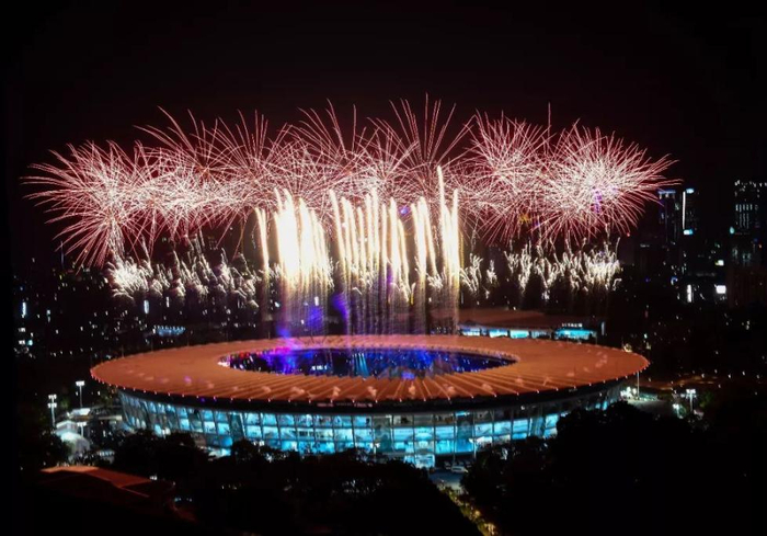 8月18日,第18届亚运会开幕式在印度尼西亚雅加达举行。这是开幕式上燃放烟花。新华社记者李响摄