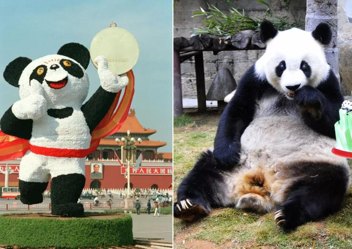 左图:北京亚运会吉祥物熊猫“盼盼”的造型矗立在北京天安门广场上,笑迎天下客(1990年9月15日摄);右图:“盼盼”的原型“巴斯”在品尝福州熊猫世界为它准备的生日蛋糕(2010年11月13日摄)