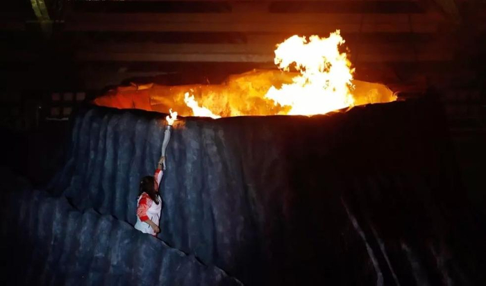 8月18日,最后一棒火炬手王莲香在点火仪式上。新华社记者王丽莉摄