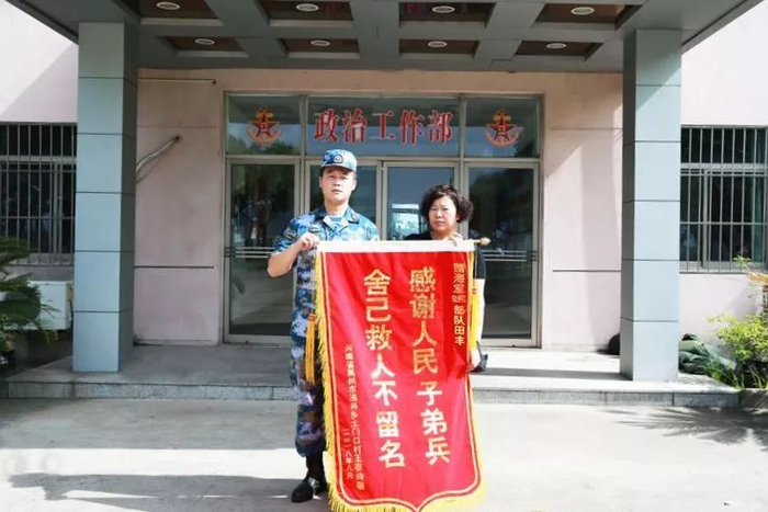 8月20日上午,东部战区海军某驱逐舰支队政治工作部会议室里,来自河南省禹州市的王春玲女士在辗转了足足一月时间后,终于将一封亲手写的感谢信和一面印有“感谢人民子弟兵,舍己救人不留名”的锦旗,交到了该支队勤务保障队战士田丰手中。