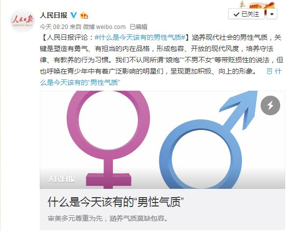 同日晚,人民日报评论部微信公号也发表文章《什么是今天该有的“男性气质”》,该文章表示,“我们不认同所谓“娘炮”“不男不女”等带有贬损性的说法,但也呼唤在青少年中有着广泛影响的明星们,呈现更加积极、向上的形象”。