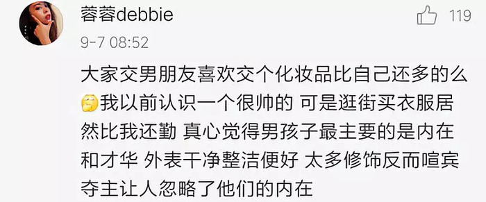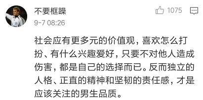 部分网友认为,爱美之心人皆有之,男生化淡妆、适当追求整洁精致的外表没有什么不合适,主要是看内在气概和才华,独立的人格、正直的精神和坚韧的责任感才是更值得我们倡导的男性品质。