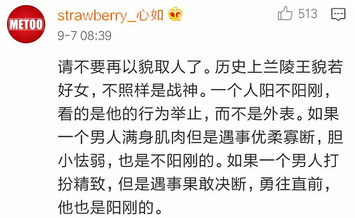 而关注男性气质的构建,也更应该发扬内在的勇气、坚强和担当等诸多品质。这种品质,我们在保家卫国的军人身上可以看到,在为国争光的体育运动员身上可以看到,在梅兰芳、程砚秋等杰出演员身上同样也能看到,他们外形或许少了些棱角、多了些清秀,但是高尚品格、家国情怀同样值得推崇。