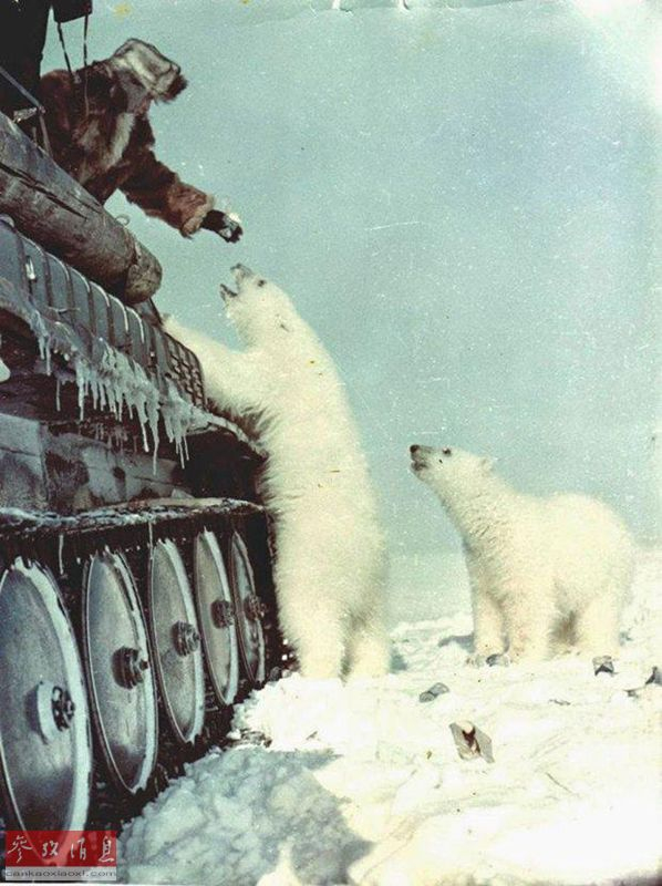 还有一些照片拍摄的是士兵在GT-SM GAZ-34036水陆两栖运输车(当时曾大批量列装苏军,主要用于雪地运输)上给北极熊喂食的场面。