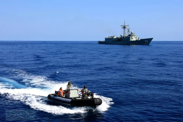12日下午,急促的战斗警报声再次响起。在红方第二特混小队指挥舰、澳大利亚“纽卡斯尔”号护卫舰舰载直升机引导下,黄山舰和新加坡“勇士”号护卫舰高速穿越狭窄的范迪蒙湾,搜索打击在此游弋的蓝方巡逻艇。推开黄山舰作战室舱门,浓烈的战斗气息扑面而来,键盘敲击声不绝于耳,指挥口令声简短有力,对海和对空两个方面作战系统以及各观察警戒部位进入临战状态,通信部位使用约定信号第一时间将海空情通报给特混小队各舰。“全时保持高度戒备状态、随时准备应付各种复杂局面,已经成为此次黄山舰参与实兵对抗的常态。”黄山舰舰长艾鹏介绍。