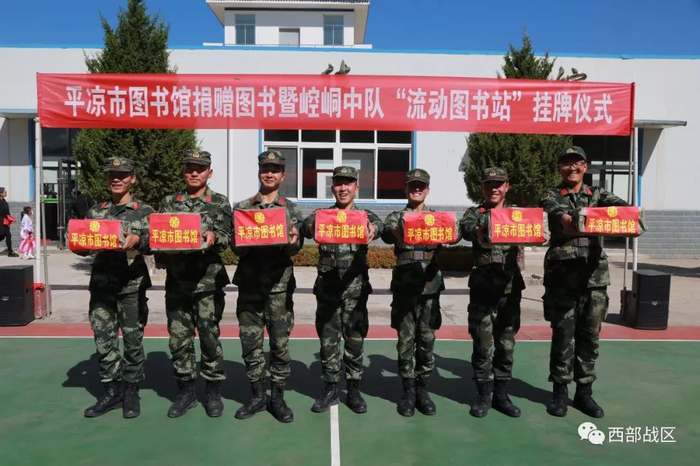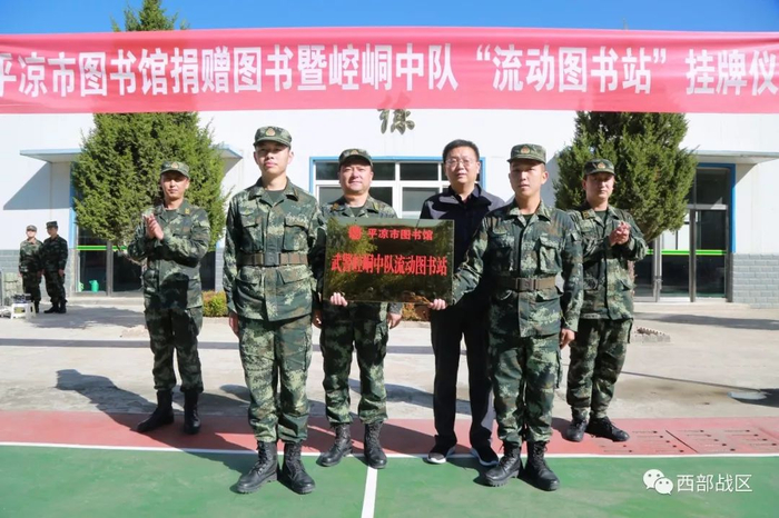 10月1日上午,在庆祝建国69周年之际,平凉市图书馆图书捐赠暨“流动图书站”挂牌仪式在平凉支队崆峒中队举行。他们根据官兵阅读需求,精心筛选200余册图书,为该支队官兵送上了一顿丰富的“文化大餐”。(王治国、荣令堃)