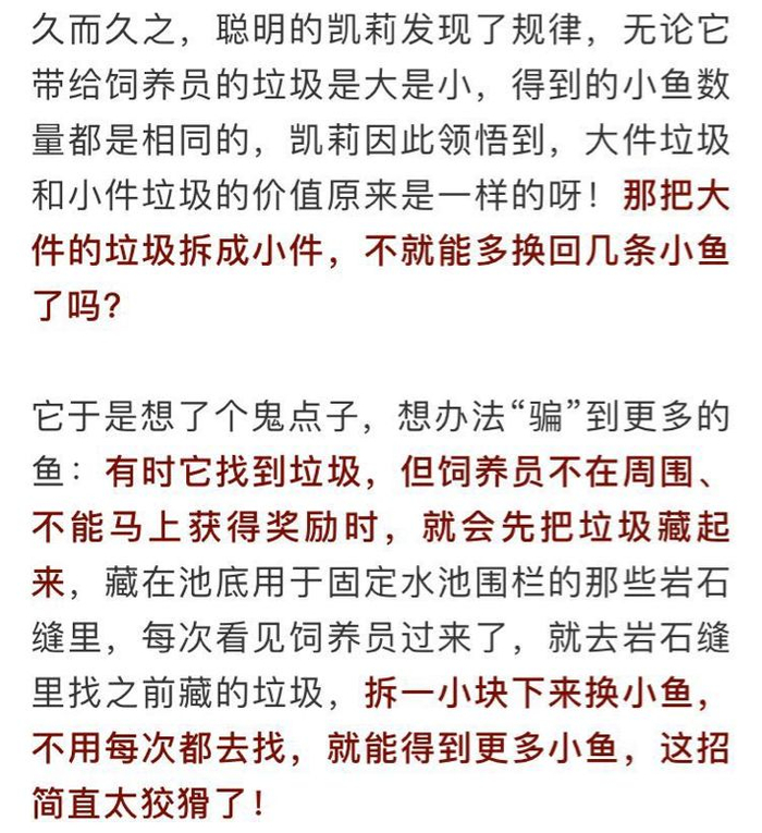 直到海洋馆整修时,决定把围栏换成玻璃,大家施工时在岩石缝里发现大大小小的垃圾,才醒悟到凯莉为什么总是直奔这里而来,原来是这个小聪明鬼自己藏的呀!