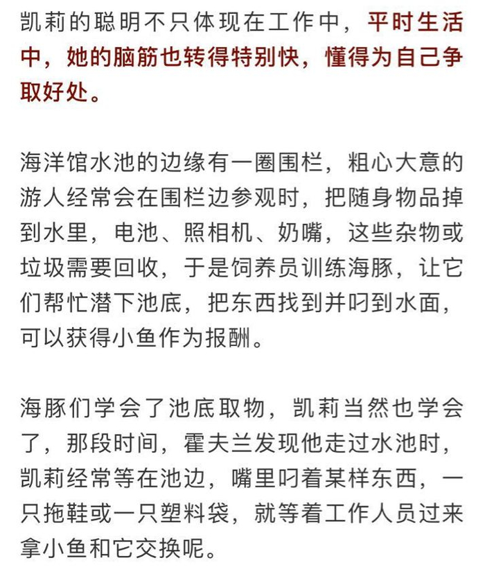 凯莉这招把饲养员们都骗了,他们过了一段时间才弄明白是怎么回事,和别的海豚去池底寻找垃圾不同,他们发现凯莉总是直接潜下水,直奔岩石缝而去,就好像提前知道垃圾在哪一样,这让饲养员们觉得很奇怪。