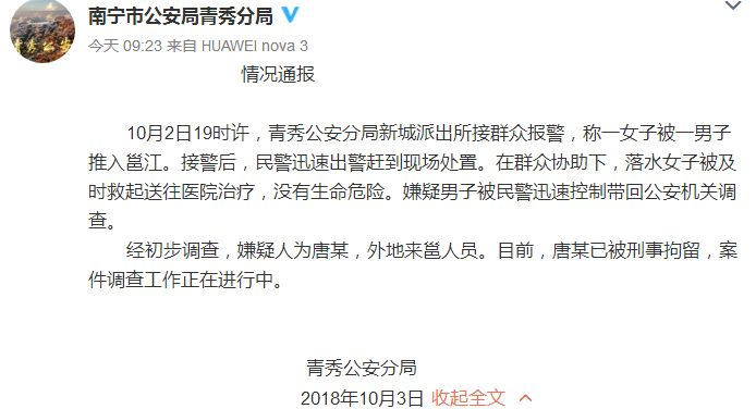 10月3日,广西南宁市公安局青秀分局微博发布通报称,事发南宁,女子被推入的是邕江,幸得路人及时救起,目前没有生命危险。而嫌疑男子已被警方控制。