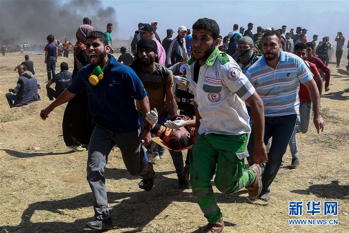 5月14日,在加沙城以东的加沙地带与以色列交界地区,人们转移一名在冲突中受伤的巴勒斯坦示威者。巴勒斯坦民众14日在巴各地举行大规模游行示威,抗议美国驻以色列使馆在耶路撒冷开馆。巴勒斯坦卫生部加沙地带负责人优素福·阿布·里什在当晚召开的新闻发布会上说,当天加沙地带的冲突导致至少55名巴勒斯坦人死亡、约2770人受伤。死者中有7名未成年人和一名救护人员,伤者中有1200多人被以军士兵实弹击中。新华社发