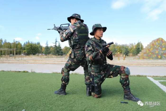 新排长踏入训练场第一课,是看“老猎人”们的集体秀,由一营两个作战小分队演示射击姿势。身着墨绿猎人迷彩,奔尼帽圆边的阴影遮不住他们黝黑的脸庞,队员们全部双持武器,步枪在胸前,手枪挂右腿,小队长展开队形基本手语指挥。