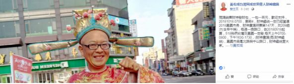 时隔两年,此人的身影又出现在大众视野中。他称要参选2018“九合一”,还曾在今年7月扮成“财神”上街招揽人气,甚至在“战车”上贴满“千元大钞”(其实是伪钞——编者注)博眼球。