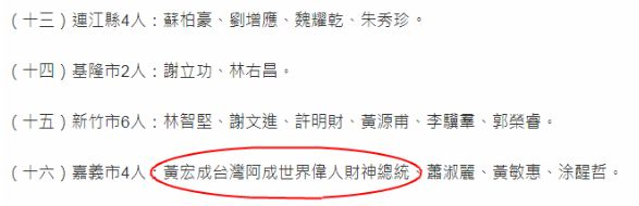 “黄宏成台湾阿成世界伟人财神总统”。