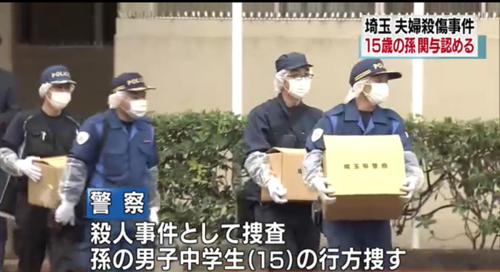 同时,有目击者向警方称,在警方接到报案的相同时间段,曾目睹到一名持刀少年在案发现场附近走动。19日上午10时前,在离案发现场约20公里的川越市的川越站附近发现了该夫妇的孙子,并将其抓捕归案。