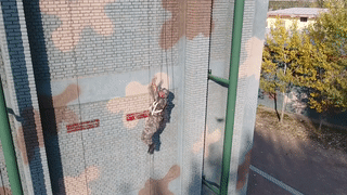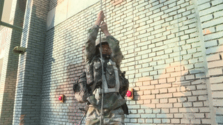 “开始!”考官一声令下,早已准备就位的参赛队员迅速按下计时器,赤手握紧攀登绳,携带武器装备,全副武装抓着悬垂的绳索攀援而上。为紧贴实战,考官明确要求所有参赛队员不得将枪插入外腰带内,不得借用其他物资器材进行固定。