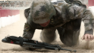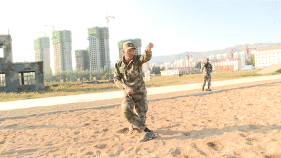 单兵战术场尘土飞扬,热浪滚滚,只见参赛队员在低、高姿网下任意切换姿势,奋勇向前,手腕破了,衣服烂了,丝毫不影响他们前进的速度。