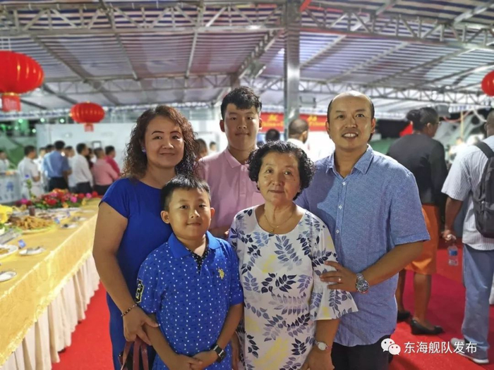 ▲韩清发在和平方舟甲板招待会上拍了一张全家福。他对两个儿子说:“孩子,这艘船就是流动的祖国。”