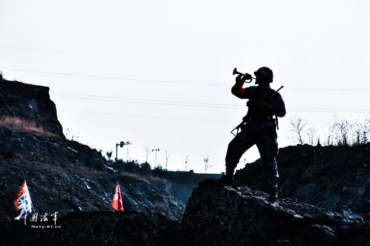 随着两发信号弹升空,指挥员一声令下:“出发!”在司号员激昂的冲锋号角下,尖刀班一马当先,冲出营门,其余官兵整齐有序、紧随其后。
