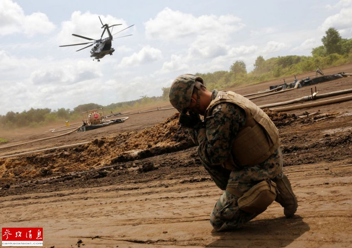 图为1名美海军陆战队员正在与空中机动的直升机进行空地联络以执行战场任务。