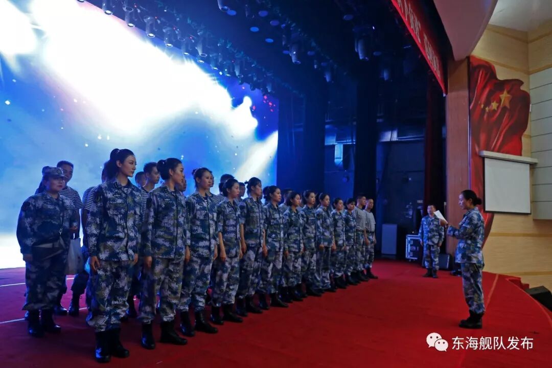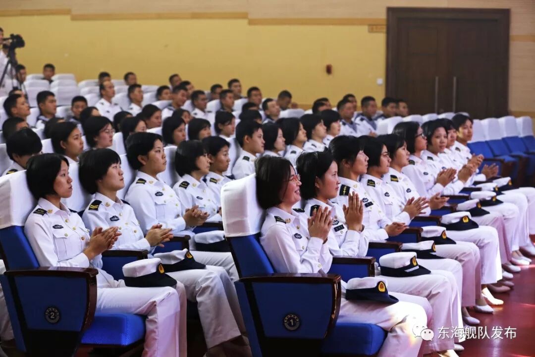 ▲ 胡爱萍领队向“蓝色文化先锋艇”队员们传达战区海军政治工作部发来的表扬电