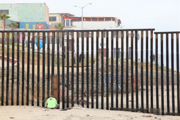 资料图:在圣迭戈美墨边境墙美国一侧,美国工人在修补边境墙上的破洞。新华社记者黄恒摄