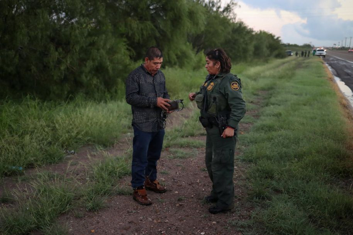美国佩尼塔斯,画面前方是一名被捕的非法入境人员,边境巡逻队员站在他的身后。