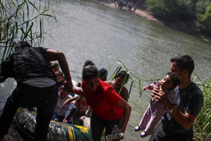 在从墨西哥非法入境美国后,一名男子将一个5个月大的洪都拉斯小女孩抱起,一同非法入境的还有来自中美洲的一家人,他们正在墨西哥境内的里奥格兰德河等待着入境美国。