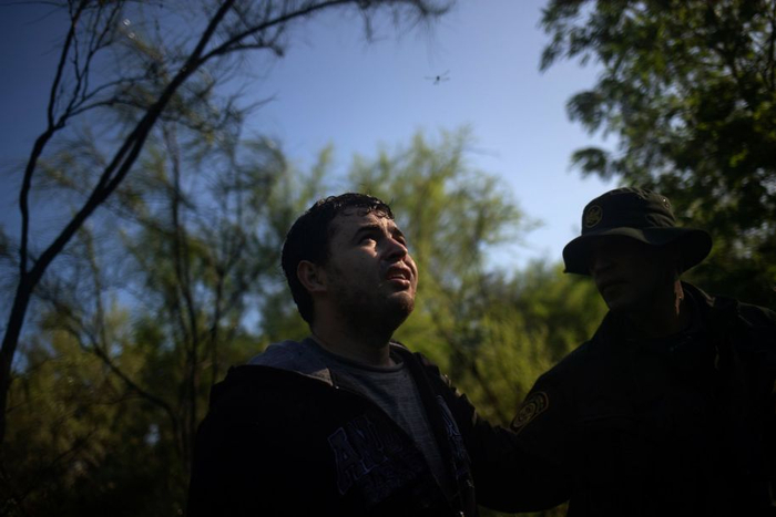 美国米申,一名男子正望向天空中的巡逻直升机,这名男子来自洪都拉斯,因非法入境被捕。