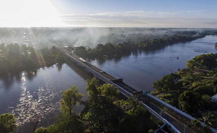 这是10月23日在墨西哥伊达尔戈航拍的连接墨西哥和危地马拉的大桥。此前一天,大批洪都拉斯移民由此进入墨西哥。近日,数千名洪都拉斯、危地马拉和萨尔瓦多等中美洲国家民众穿越边界进入墨西哥南部,并计划继续向北前往美国。此次中美洲国家部分民众的“北上”,引发相关国家忧虑,或影响美国与墨西哥及相关中美洲国家之间的关系。新华社/法新