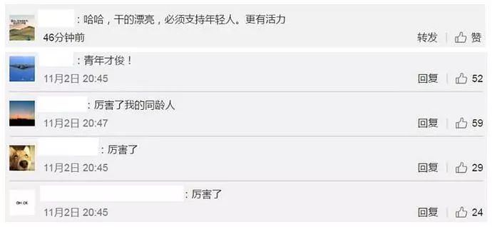 不过,也有网友表示,“必须支持年轻人,更有活力”,“厉害了我的同龄人”。