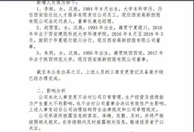 根据公司发布的简历,新任董事长李甜为1984年8月出生,女,大学本科学历,“历任西安佰仕达人才服务有限责任公司员工。现任西安高新控股有限公司法定代表人,董事长兼总经理。”