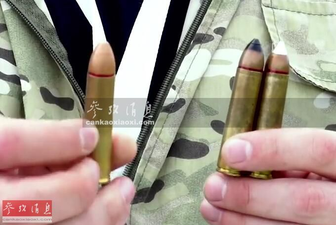 记者展示ASh-12使用的三种弹药,金属弹头的为重型亚音速弹、黑色的为穿甲弹、白色的为轻型超音速穿甲弹。