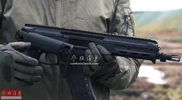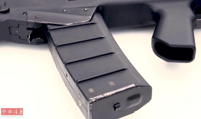 AM-17可以直接通用AK-74突击步枪的标准弹匣(5.45x39mm口径),图中使用的是聚合物弹匣(带金属底座),还标有残余弹数指示器。