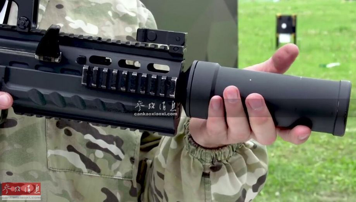图为加挂有不同战术配件的ASh-12突击步枪,从上到下依次为战术握把、下挂左轮式枪榴弹发射器、消音器。