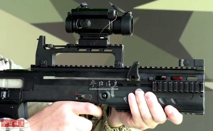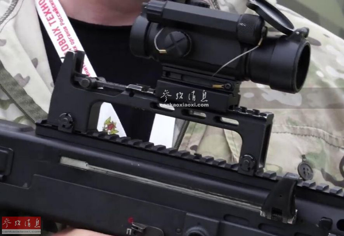 ASh-12步枪的导轨系统及Aimpoint Comp M4内红点瞄具特写。