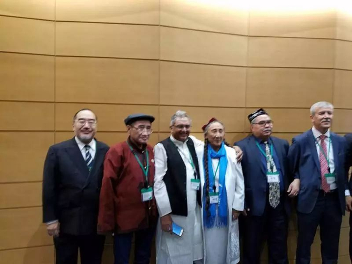 上月27日,田中健之(左一)与"疆独"领袖热比娅(右三)及其他反华组织代表合照。网上图片