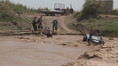 6月23日10时许,新疆阿克苏地区库车县乌尊镇一对夫妇驾驶着拖拉机过河途中,因河水上涨被洪水围困。库车县消防大队立即出动两辆救援车,包括12名官兵和乌尊镇派出所民警在内,共同实施营救。