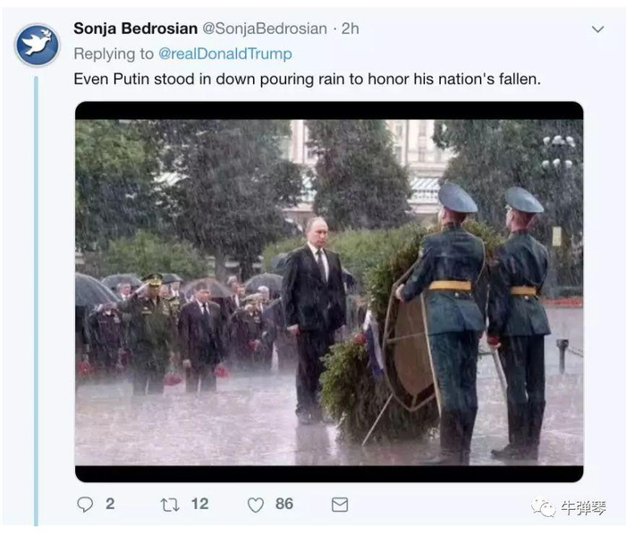 愤怒之余,一些美国人还特意贴出了普京的照片,当时也是普京冒雨向阵亡者致敬,而且还是瓢泼大雨,不是丝丝的小雨。